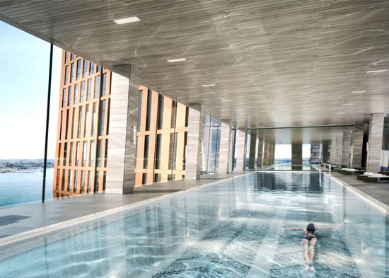 建筑將包括近 800 個套間,可用作工作室或者套間的公寓。三層天橋里有一個 75 英尺 (23 米) 長的游泳池、熱水浴池、酒吧和會客廳,相當于是整體住宅的交流中心。橋本身是封閉的,兩邊安裝了玻璃幕墻,可以眺望對面 East River 的景色和曼哈頓建筑群。身處在其中恐怕會忘記這是一架懸空的橋梁,但看風景的絕好視線想必會增加游泳或鍛煉的動力吧。
