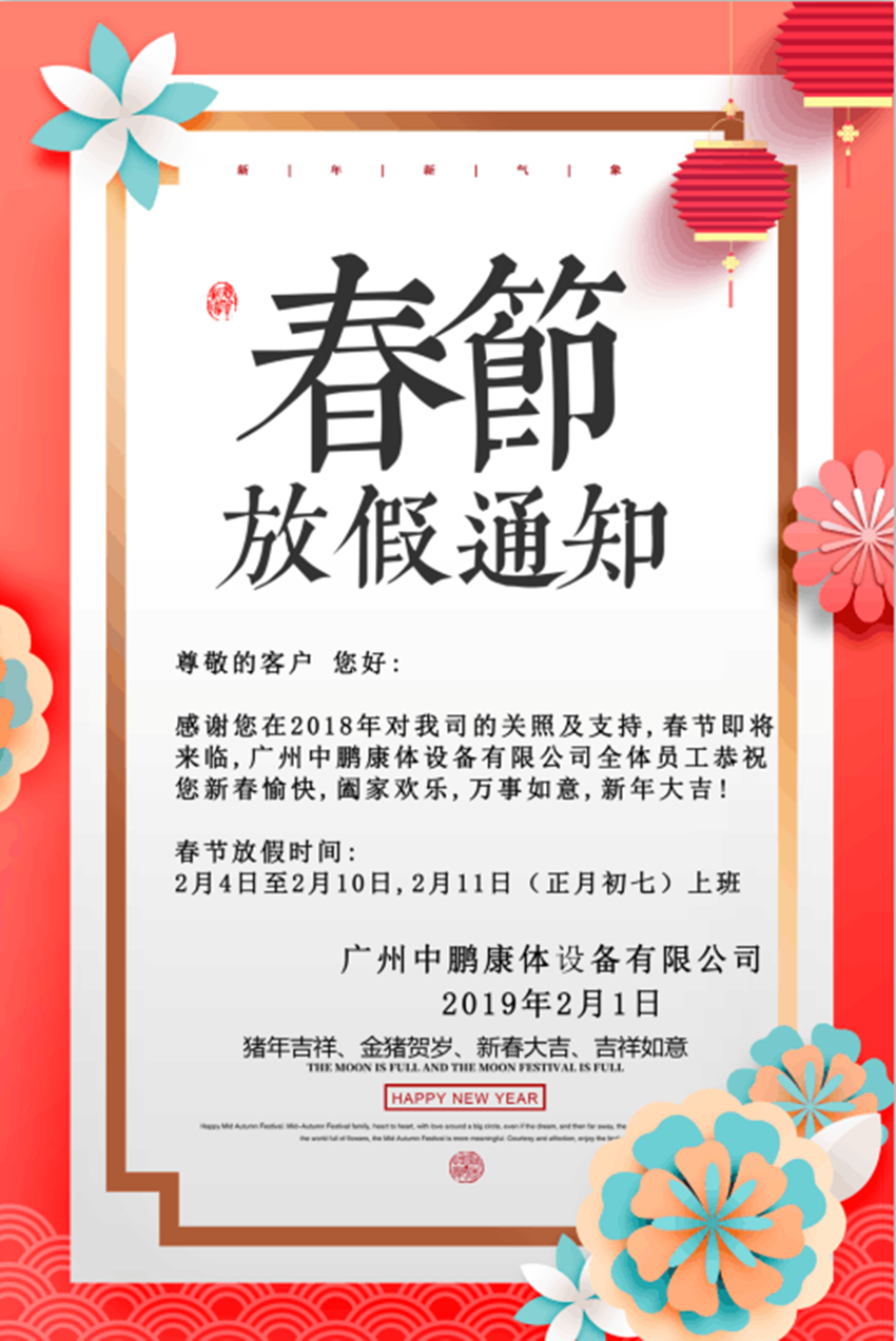 感謝您在2018年對我司的關照及支持,春節即將來臨,廣州中鵬康體設備有限公司全體員工恭祝您新春愉快,闔家歡樂,萬事如意,新年大吉!